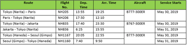 Based on the schedule, how long is the flight from Paris to Tokyo (Narita)?
