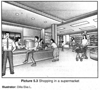 Gambar soal memperlihatkan kegiatan belanja di supermarket pada minggu lalu. Dengan demikian aktivitas yang mereka lakukan adalah;