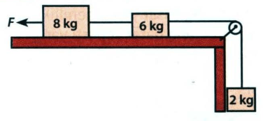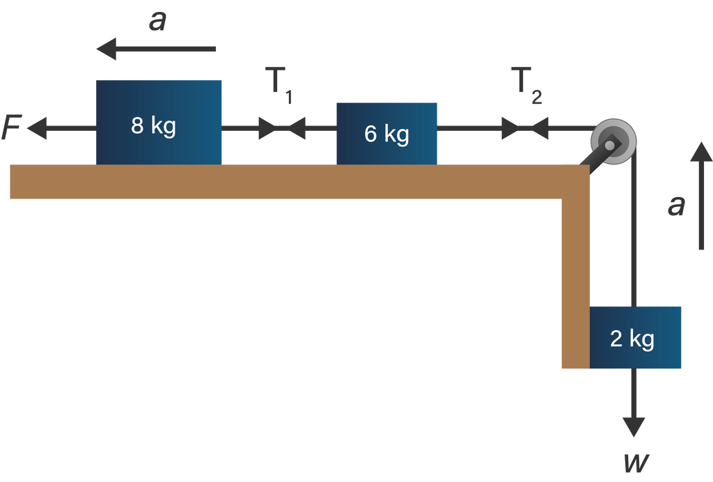 Jika permukaan meja licin dan massa tali diabaikan, serta gaya yang bekerja pada balok yang bermassa 8 kg adalah 24 N, tentukan percepatan yang dialami balok!