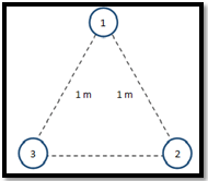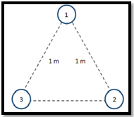 Tiga buah benda bermassa m, 2m, dan 3m diletakkan membentuk segitiga sama sisi dengan panjang sisi 1 meter seperti pada gambar.