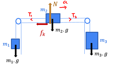 Tiga buah benda dihubungkan dengan katrol seperti gambar di samping. Jika , dan , sedangkan koefisin gesekan kinetis bidang sentuh adalah , maka besar tegangan tali yang menghubungkan benda dan adalah... ( )
