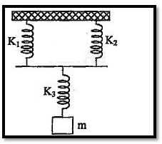 Tiga buah pegas disusun seperti pada gambar di bawah ini. Konstanta masing – masing pegas secara berurutan adalah, k1 = 200 N/m, k2 = 400 N/m, dan k3 = 200 N/m. Susunan pegas dipengaruhi oleh beban m sehingga mengalami pertambahan panjang sebesar 5 cm. Jika g = 10 m/s2 dan pertambahan panjang pegas 1 dan 2 sama, maka massa beban m adalah ….