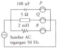 Tiga lampu P, Q dan R dihubungkan ke sumber tegangan AC 50 Hz seperti ditunjukkan pada gambar di samping. Manakah lampu yang menyala paling redup?