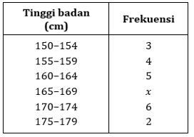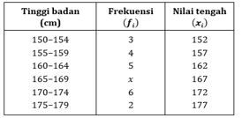 Jika rata-rata tinggi badan siswa di kelas tersebut adalah 165, maka banyaknya siswa di kelas tersebut adalah ....