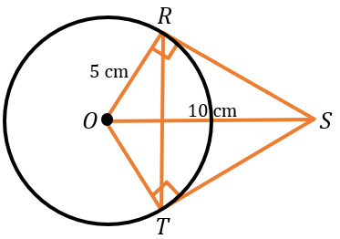 Titik S berada di luar lingkaran dan berjarak 10 cm dari titik O sebagai titik pusat lingkaran. Diketahui jari-jari lingkaran adalah 5 cm. Jika dari titik S dibuat dua garis singgung lingkaran yang menyinggung lingkaran di titik R dan T, maka panjang tali busur RT adalah ... cm.