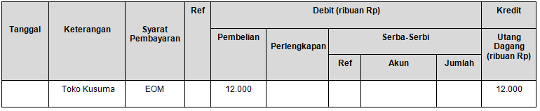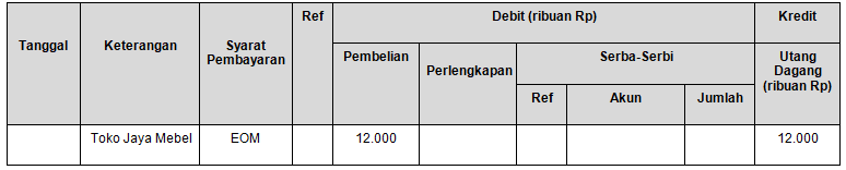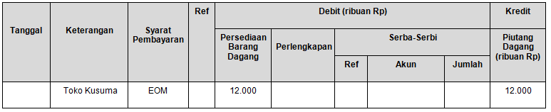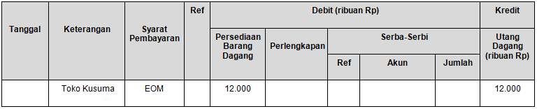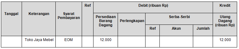 Toko Jaya Mebel membeli seperangkat sofa dari Toko Kusuma sebesar Rp12.000.000,00 dengan syarat EOM. Jika Toko Jaya Mebel menggunakan metode pencatatan perpetual, maka pencatatannya pada jurnal yang benar adalah ….