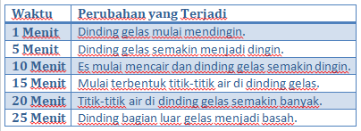 Tono memasukkan es batu ke dalam gelas. Setelah beberapa waktu, ternyata terdapat perubahan yang terjadi pada dinding gelas kacanya. Berikut perubahan yang terjadi: