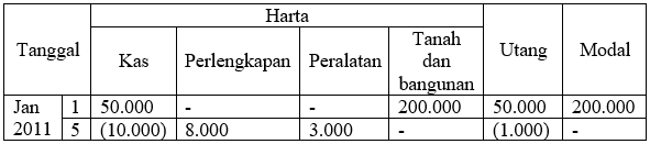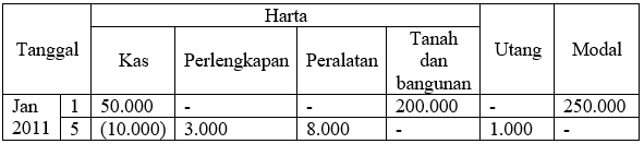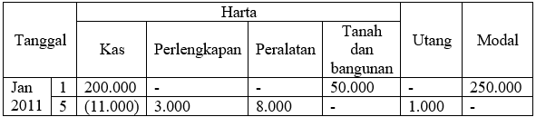 Tanggal 5. Dibeli peralatan salon Rp8.000.000,00 dan perlengkapan senilai Rp3.000.000,00 baru bayar Rp10.000.000,00.