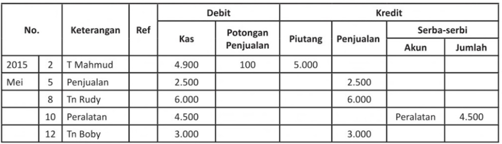2015 Mei 2 : diterima pelunasan faktur dari Tuan Mahmud seminggu yang lalu Rp5.000.000,00 syarat 2/10, n/30