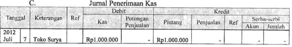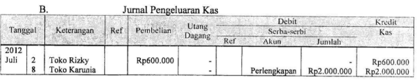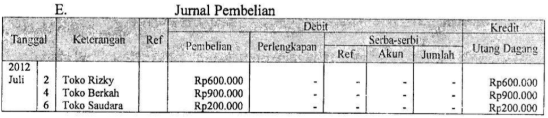 Jurnal pembelian pada jurnal khusus perusahaan dagang adalah pembelian secara kredit atau secara utang, sedangkan pembelian secara tunai dicatat ke dalam jurnal pengeluaran kas. Berdasarkan soal tersebut, maka jurnal pembelian dan jurnal penerimaan kas selama transaksi bulan Juli 2012 oleh Toko Maju dengan jurnal umum sebagai berikut :