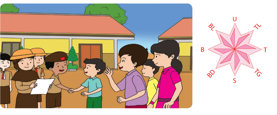 Udin dan teman-teman berbagi tugas menerima tamu. Pembagian tugas berdasarkan denah sekolah yang sudah disiapkan. Udin dan Lani bertugas menjelaskan bagian utara sekolah. Edo dan Dayu bertugas menjelaskan bagian selatan sekolah. Siti bertugas menjelaskan bagian timur sekolah. Beni menjelaskan bagian barat sekolah.