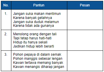 3) Pantun 3: Pantun tersebut menggunakan rima silang dan terdiri atas 38 suku kata yang terbagi menjadi 10 suku kata pada baris pertama, 9 suku kata pada baris kedua, 9 suku kata pada baris ketiga, dan 10 suku kata pada baris terakhir.