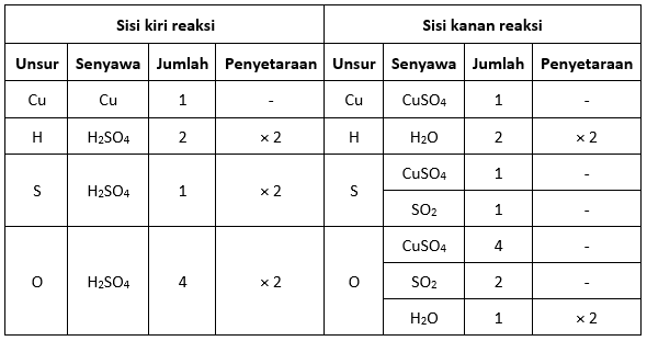 Logam tembaga + larutan asam sulfat larutan tembaga(II) sulfat + gas belerang dioksida + air