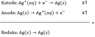 Tuliskan reaksi elektrolisis larutan perak nitrat dengan katode besi dan anode perak.