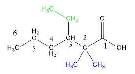 Tuliskan rumus struktur dari senyawa asam 3-etil-2,2-dimetilheksanoat!