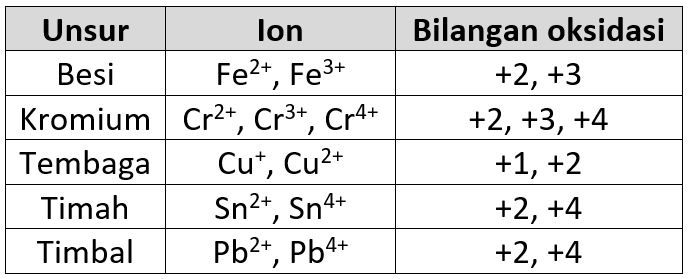 Tuliskan unsur-unsur logam yang memiliki lebih dari satu jenis bilangan oksidasi, kemudian tuliskan ion yang dapat terbentuk!