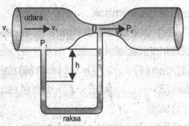 Udara mengalir melalui tabung utama horizontal pada sebuah venturimeter seperti terlihat pada gambar. Jika tabung U sistem ini berisi raksa, hitunglah selisih ketinggian h antara dua kolom raksa. Diketahui , , , dan .