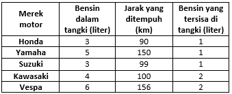 Uji coba lima merek motor terhadap pemakaian bahan bakar pertalite dihasilkan sebagai berikut.