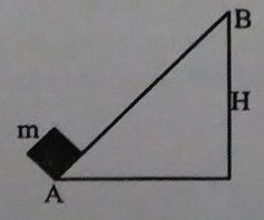 Usaha yang diperlukan untuk mendorong balok m = 10 kg sepanjang bidang miring kasar dari A ke B adalah 400 J. Sebaliknya bila di tarik dari B ke A diperlukan usaha sebesar 250 J. Anggapan gaya dorong dan tarik di atas sejajar bidang miring, maka tinggi bidang miring H = ….