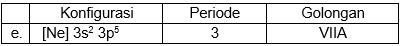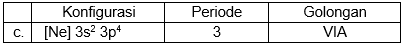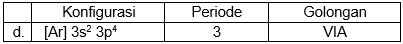Unsur A dengan nomor atom 16, pasangan data yang tepat mengenai konfigurasi elektron, periode, dan golongan unsur A dalam Tabel Periodik Unsur adalah ....