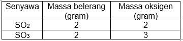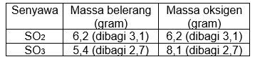 Unsur belerang dan oksigen dapat bereaksi membentuk dua jenis senyawa, yaitu belerang dioksida dan belerang trioksida . Belerang yang bereaksi masing-masing sebanyak 6,2 gram dan 5,4 gram. yang terbentuk mengandung 6,2 gram oksigen, sedangkan dalam diperoleh 8,1 gram oksigen. Perbandingan massa unsur oksigen pada kedua senyawa tersebut adalah ....