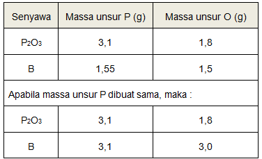 Unsur fosfor dan oksigen dapat membentuk dua jenis senyawa. Senyawa A mengandung 3,1 g dan 1,8 g . Sementara itu, senyawa B mengandung 1,55 g dan 1,5 g