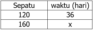 Untuk membuat 120 pasang sepatu, seorang pengrajin memerlukan waktu selama 36 hari. Waktu yang diperlukan pengrajin untuk membuat 160 pasang sepatu adalah....