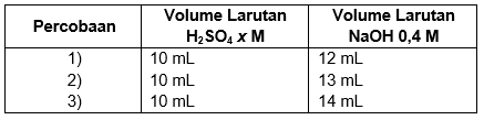 Untuk menentukan konsentrasi larutan , larutan tersebut diambil 10 mL, lalu dititrasi dengan larutan . Data titrasi yang diperoleh sebagai berikut.
