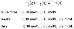 Untuk reaksi diketahui konsentrasi awal dan . Jika pada saat kesetimbangan masih tersisa , maka harga tetapan kesetimbangan ...