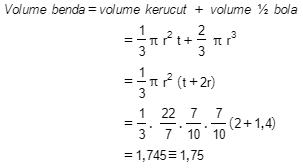 Volume pendulum berbentuk gabungan kerucut dan setengah bola yang berdiameter 1,4 cm dan tinggi kerucut 2 cm adalah ... cm3.