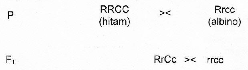 Warna rambut hitam pada tikus dikendalikan oleh gen R dan C bersama-sama. Gen C dan rr menyebabkan warna krem, jika ada gen cc maka tikus menjadi albino. Pada diagram persilangan berkut :