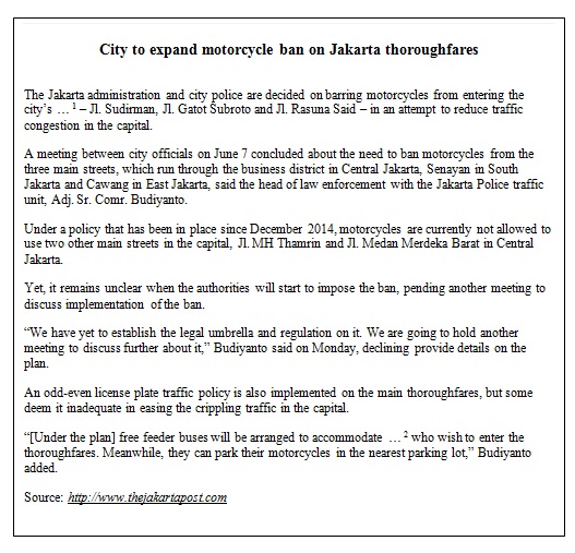 What is the appropriate noun phrase to complete the sentence, The Jakarta administration and city police are decided on barring motorcycles from entering the city’s…