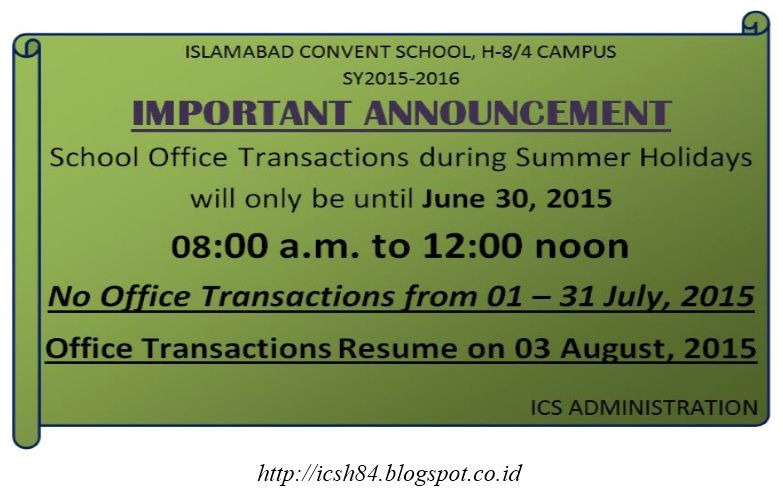 School Office Transaction’s schedule during summer holiday.