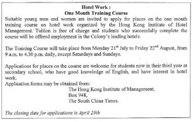 Berdasarkan kalimat “Applications for places on the course are welcome for students now in their third year at secondary school, who have good knowledge of English, and have interest in hotel work” yang terdapat pada paragraf ke-3, dapat diketahui bahwa pendaftaran pelatihan dibuka untuk siswa kelas 3 yang memiliki kemampuan berbahasa Inggris yang baik dan minat terhadap pekerjaan hotel sehingga pilihan jawaban (C) adalah yang paling tepat.