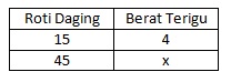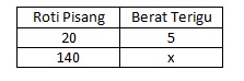 Winda membuat dua macam roti, yaitu roti isi pisang dan roti isi daging. Untuk membuat 20 roti isi pisang dibutuhkan 5 kg terigu dan untuk membuat 15 roti isi daging dibutuhkan 4 kg terigu. Berat terigu yang dibutuhkan jika winda membuat 140 roti isi pisang dan 45 roti isi daging adalah ....