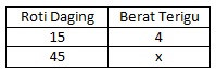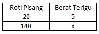 Winda membuat dua macam roti, yaitu roti isi pisang dan roti isi daging. Untuk membuat 20 roti isi pisang dibutuhkan 5 kg terigu dan untuk membuat 15 roti isi daging dibutuhkan 4 kg terigu. Berat terigu yang dibutuhkan jika winda membuat 140 roti isi pisang dan 45 roti isi daging adalah ....