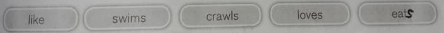 Miko is my tortoise's name. It is still a baby, about six months old. I put it in a water tank. It (11) ____ happily in the tank. I also put several small fish in the tank. Miko (12) ____ the fish. Miko eats vegetables and fruit. Miko does not (13) ____ food pallets. In the afternoon, Miko (14) ____ on a stone in the middle of the tank. It basks on the stone. Miko (15) ____ the sun.