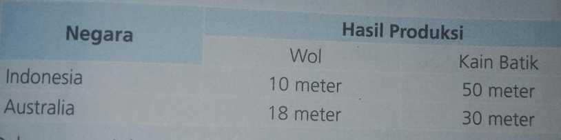 Dalam memajukan perdagangan internasional, Indonesia berspesialisasi memproduksi batik dan Australia memproduksi wol. Keuntungan orang Indonesia menjual 20 meter batik untuk mendapat wol setelah spesialisasi adalah .....