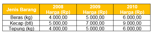 Berikut ini data perkembangan harga 3 macam barang dalam 3 tahun terakhir.