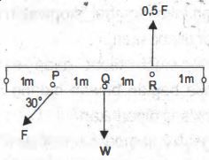 Batang homogen AB dipaku di pusat massanya dan diberi sejumlah gaya dengan kedudukan seperti gambar. Jika nilai F = W, maka keadaan batang AB akan .....