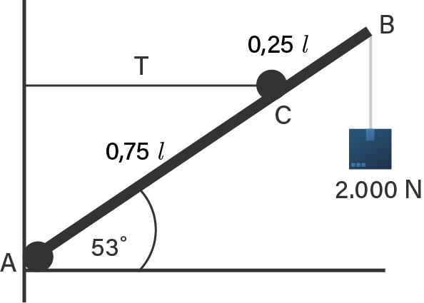 Batang AB beratnya 400 N. Engsel ditempatkan di A dan di titik C, diikat pada tembok dengan seutas tali tak bermassa. Jika sistem seimbang, maka tegangan tali T adalah ....