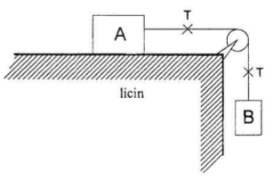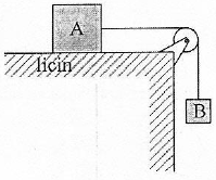 Dua benda A dan B masing-masing 2 kg dan 3 kg dihubungkan dengan tali melalui katrol seperti pada gambar !