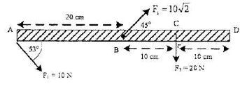 Batang AB yang massanya diabaikan diletakkan mendatar dan dikerjakan tiga buah gaya seperti gambar. Resultan momen gaya yang bekerja pada batang jika diputar pada poros di D adalah ...