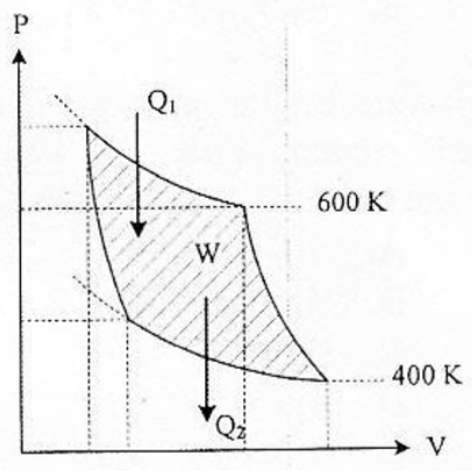 Pada grafik P-V mesin Carnot berikut diketahui reservoir suhu tinggi 600 K dan suhu rendah 400 K, Jika usaha yang dilakukan mesin adalah W, maka kalor yang di keluarkan pada suhu rendah adalah ....