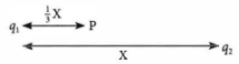 Dua partikel masing-masing bermuatan q1 dan q2 yang besar dan jenisnya tidak diketahui, terpisah sejauh X. Di antara kedua muatan itu dan pada garis hubungnya terdapat titik P pada jarak X dari q1 (seperti terlihat pada gambar di bawah). Jika medan listrik di titik P sama dengan nol, maka ....