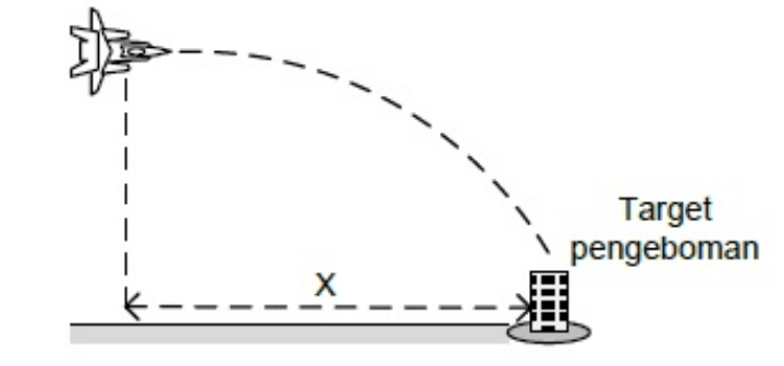 Sebuah pesawat yang sedang terbang mendatar dengan laju 300 m/s pada ketinggian 80 meter menjatuhkan bom (g = 10 m/s2). Bom tersebut tepat mencapai sasaran pada jarak mendatar adalah....