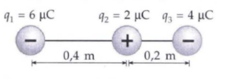 Tiga partikel bermuatan disusun dalam satu garis seperti pada gambar.