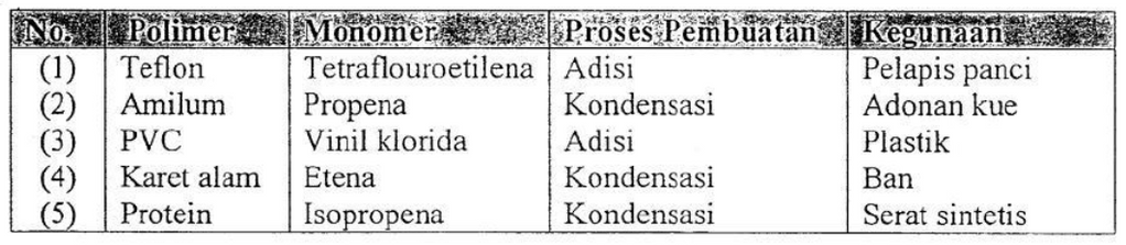 Berikut tabel yang berisi data polimer, monomer, proses pembentukan dan kegunaannya: