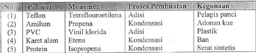 Berikut tabel yang berisi data polimer, monomer, proses pembentukan, dan kegunaannya: