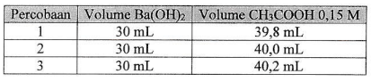 Perhatikan data hasil titrasi antara Ba(OH)2 dengan larutan asam asetat 0,15 M berikut!